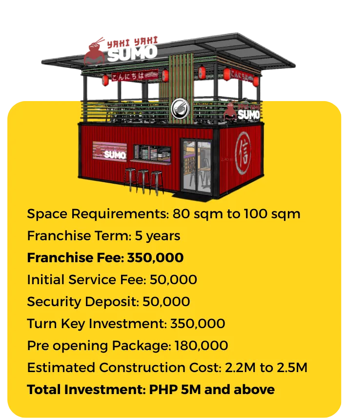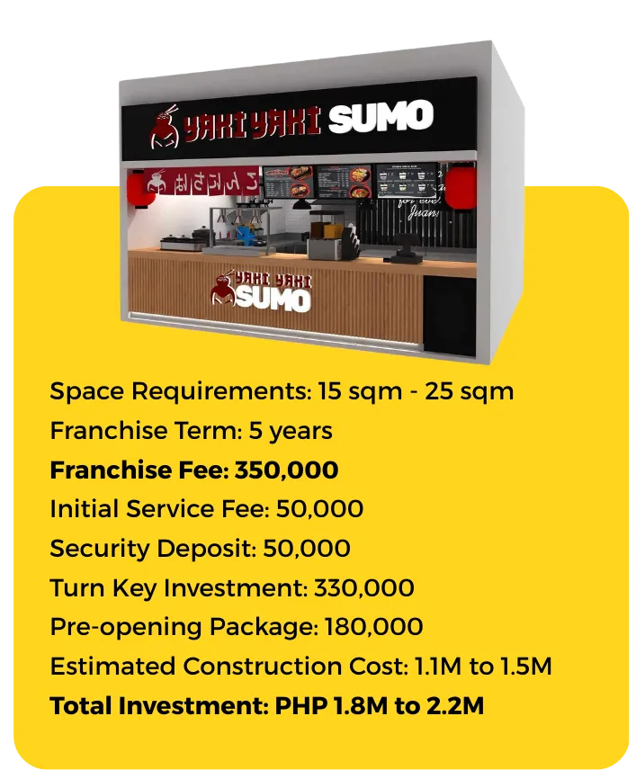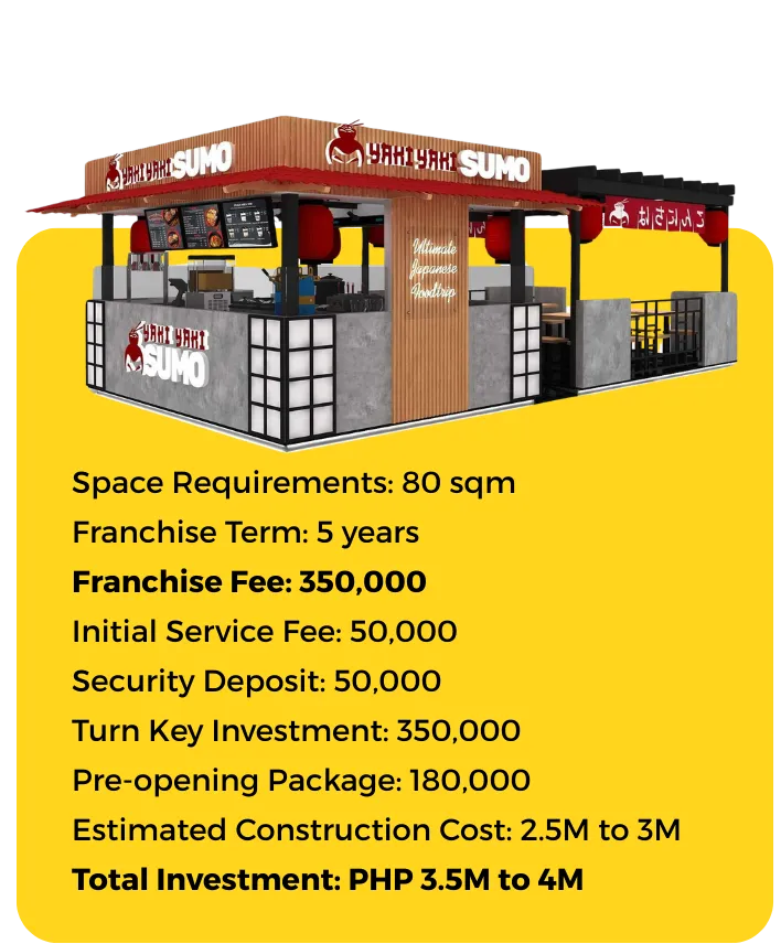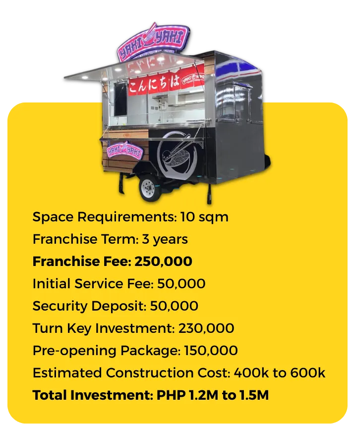 To secure your desired location and kickstart your journey with Yaki Yaki, settle the initial fee of Php 50,000. From there, our team will assist you every step of the way.